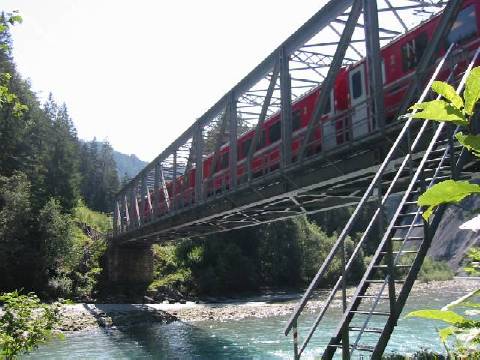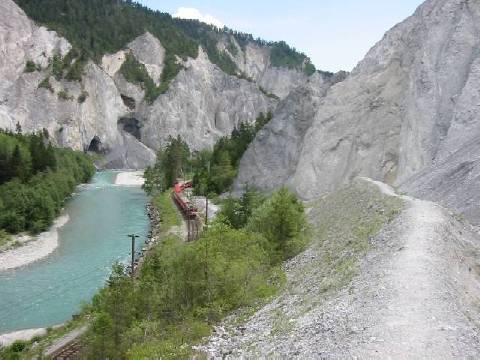 Quant à la ligne (privée) des Chemins de fer rhétiques qui suit le cours du Rhin à travers ses gorges, elle est longue de 19 kilomètres et compte 14 ponts et 3 tunnels entre Reichenau et Ilanz. Ouverte en 1903 déjà, elle s’est enrichie plus tard de quelques digues et galeries qui la mettent à l’abri des inondations et des éboulements.