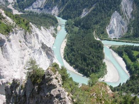 Cette « Ruinaulta » (gorges du Rhin) résulte de l’effondrement de la montagne de Flims il y a quelque 10 à 15’000 ans. Le Rhin antérieur, entre Ilanz et Reichenau, a dû alors se creuser un passage à travers cet immense éboulement de roches calcaires. D’où ce paysage surprenant, pompeusement rebaptisé "Swiss Canyon" par les offices du tourisme, que contemplent randonneurs, amateurs de rafting ou voyageurs empruntant la ligne construite en 1903 déjà par les Chemins de fer rhétiques.
