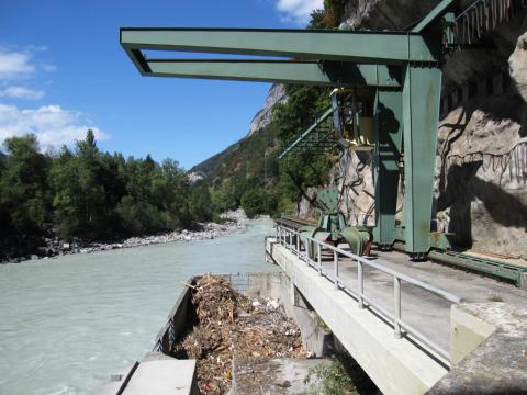 Le barrage est équipé de deux dégrilleurs, dont un entièrement automatique, qui permettent le nettoyage mécanique des grilles. Le Rhône charrie en effet d’énormes quantités de matériaux divers : branches et troncs d’arbres, sacs et bouteilles en plastique, cadavres d’animaux et autres déchets. Ce ne sont pas moins de 1’600 tonnes de détritus qui s’accumulent ainsi chaque année au barrage et qui sont sortis du fleuve par les dégrilleurs, puis déposés dans un bac avant d’être évacués vers des centres de tri et de retraitement.